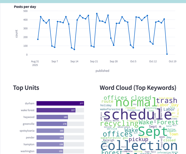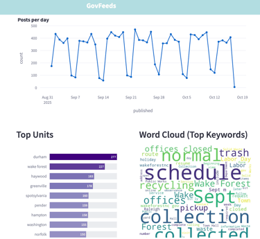 GovFeeds is the searchable index of local government social media. We aggregate county and municipal posts into one, easy-to-analyze platform so communications teams can keyword-search content, compare cities and counties, and spot recurring topics and posting patterns. Built for practitioners, GovFeeds turns scattered feeds into benchmarks and inspiration while advancing transparency in the digital public square.