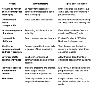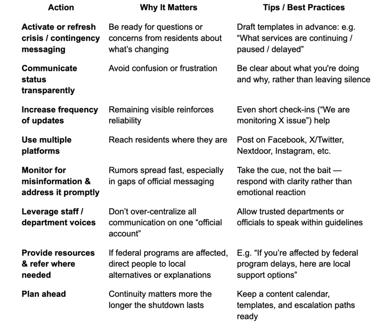 A federal government shutdown doesn’t pause the needs and concerns of residents. In fact, such silence at the national level amplifies the responsibility—and opportunity—for local governments to own the narrative, maintain clarity, and preserve trust.