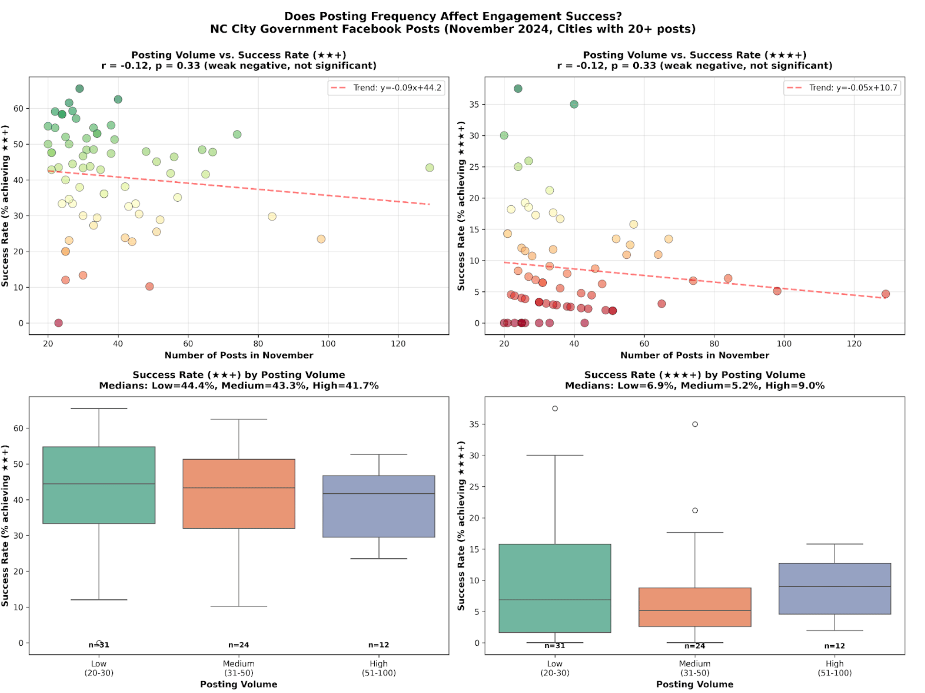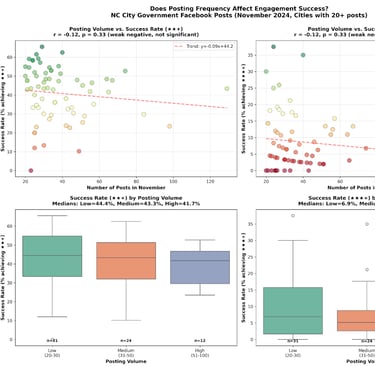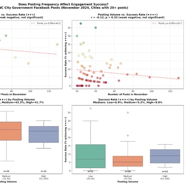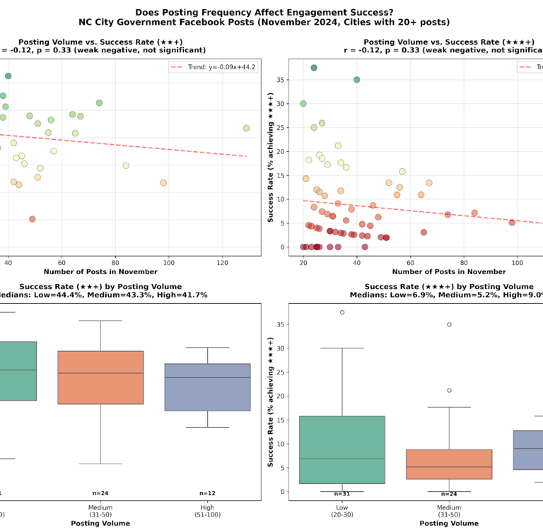 By examining posting frequency and engagement outcomes across all posts on North Carolina city Facebook pages in November 2025, we found no consistent relationship between higher posting volume and stronger engagement. In some cases, higher frequency actually correlated with lower performance.